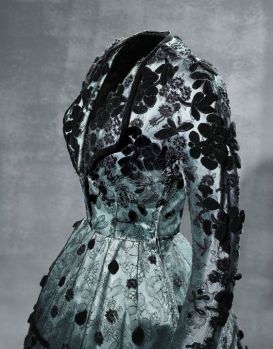 Vestido en raso de rayón y encaje mecánico de seda negra de 1947 que perteneció a doña Blanca Fernández de Rivera, marquesa de Garcillán. Sigue la estética de los años cuarenta: falda larga, cintura estrecha, y hombros armados, con reminiscencias goyescas.