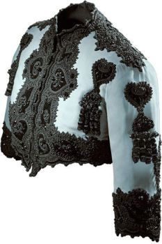 Vestido en raso de rayón y encaje mecánico de seda negra de 1947 que perteneció a doña Blanca Fernández de Rivera, marquesa de Garcillán. Sigue la estética de los años cuarenta: falda larga, cintura estrecha, y hombros armados, con reminiscencias goyescas.