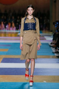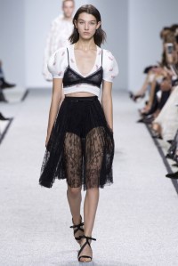 Prada ya nos sorprendió con la superposición de un top encima de todas las prendas en la colección de primavera de 2014. En esta última colección ha vuelto a jugar con la superposición de prendas mostrando tops o vestidos de escote bañera con transparencias y vaporosos sobre camisas de algodón con diversos estampado.